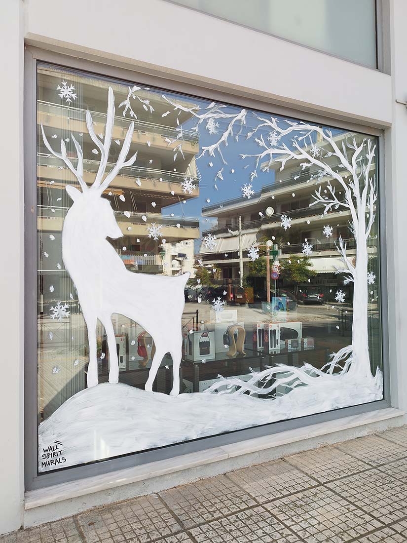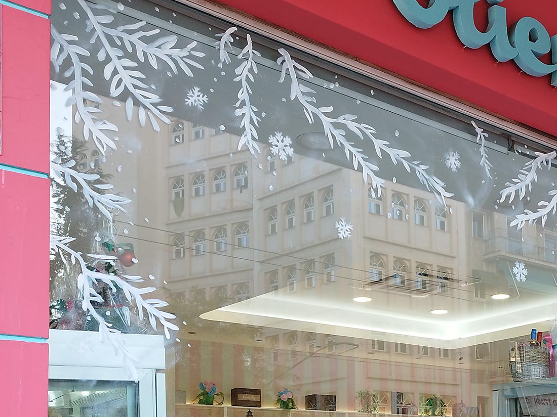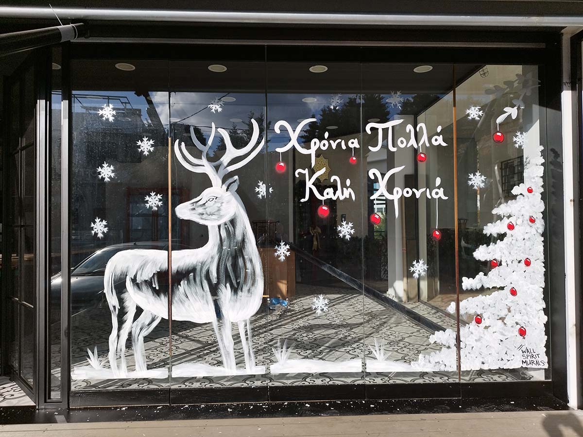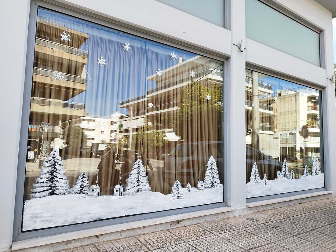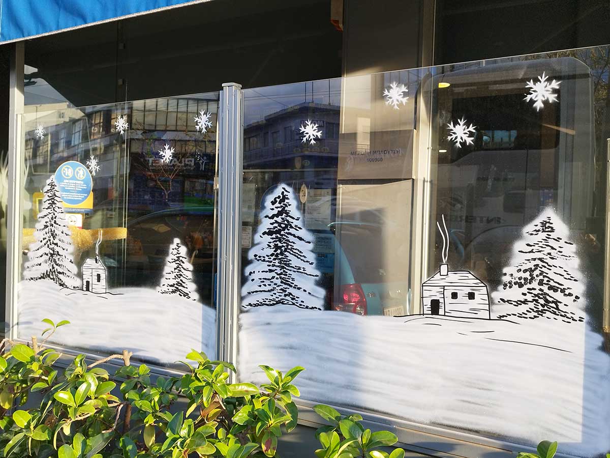 Ζωγραφίζουμε βιτρίνες και τζαμαρίες με Χριστουγεννιάτικες, Πασχαλινές και οποιασδήποτε επιθυμίας ζωγραφιές. Μετά το τέλος της εορταστικής περιόδου αφαιρούμε τις ζωγραφιές εύκολα και γρήγορα. Επικοινωνήστε μαζί μας για να ζωγραφίσουμε την βιτρίνα της επιχείρησης, τον παιδικό σταθμό ή το σπίτι σας.