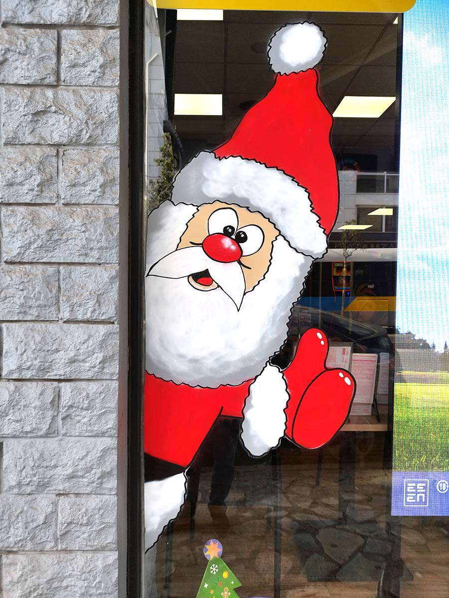 Ζωγραφική σε βιτρίνα. Χριστουγεννιάτικες ζωγραφιές και Άγιος Βασίλης για βιτρίνες και τζαμαρίες καταστημάτων.